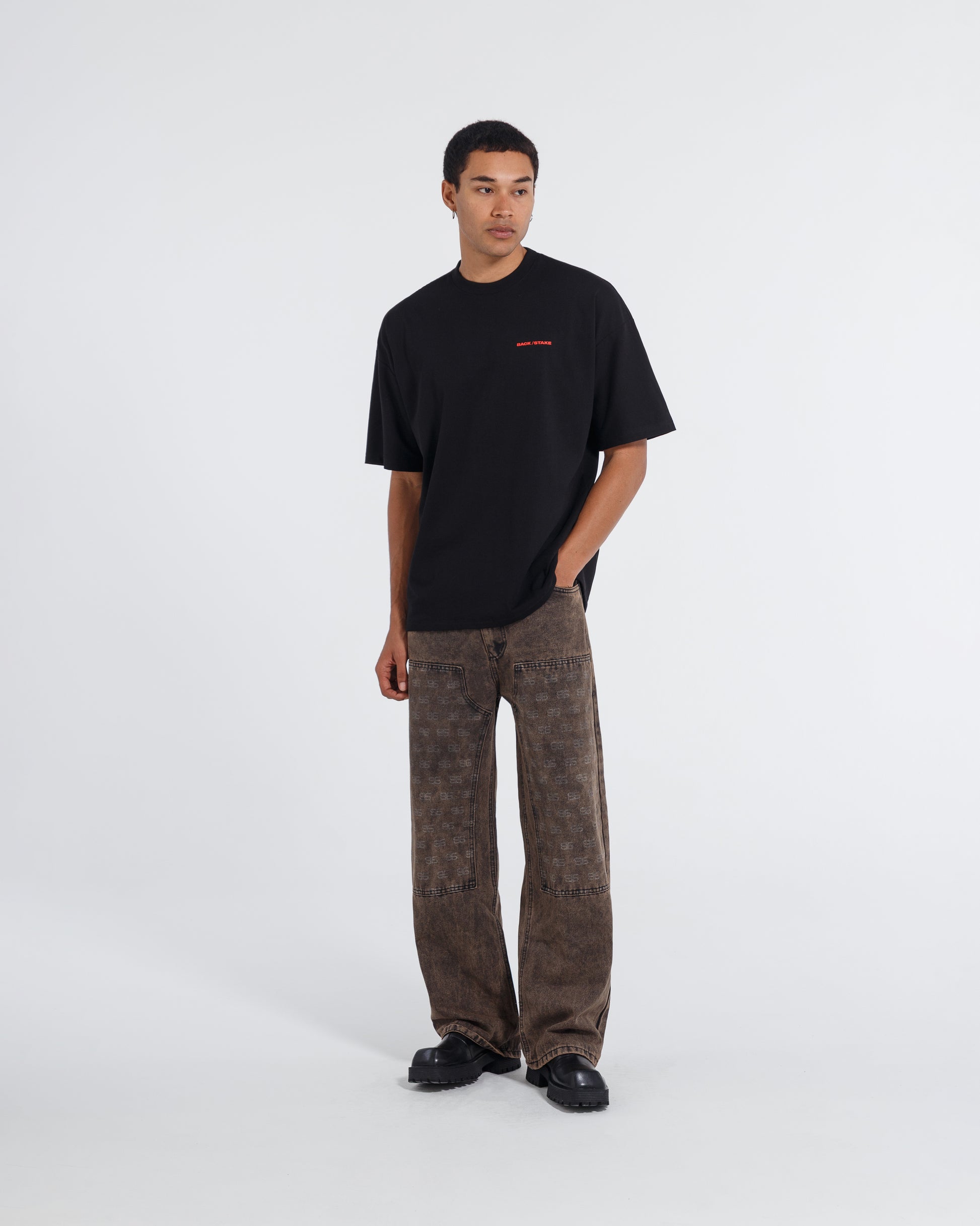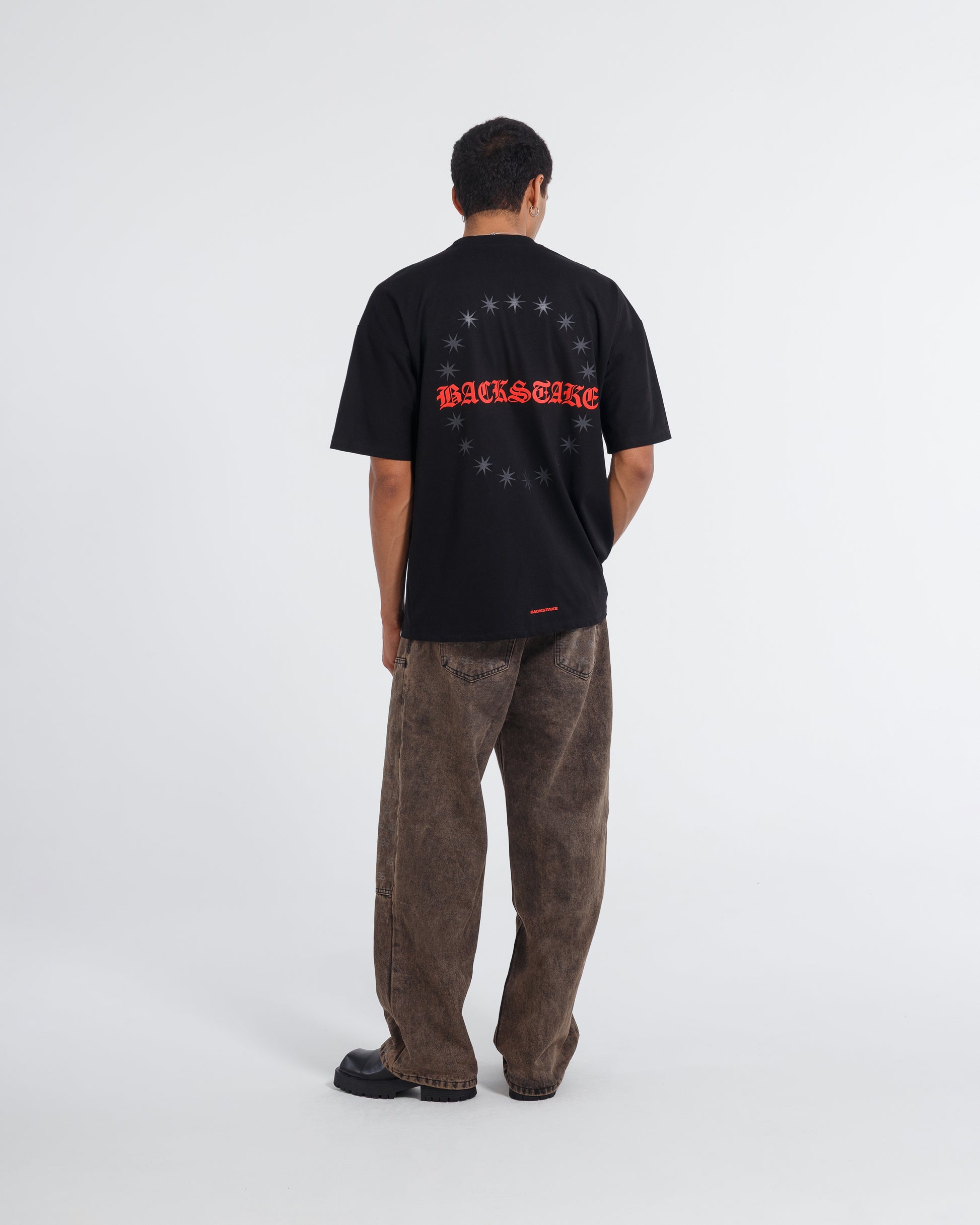 Camiseta de color Negro, elaborada en algodón premium 100% de alto gramaje (250g). Diseño posterior de circulo de estrellas y nombre de la Marca en alta densidad / Serigrafia.